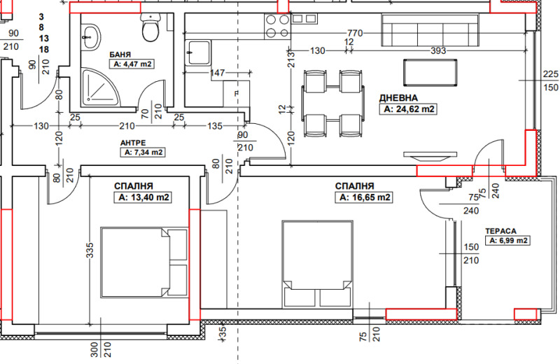 - дневна с трапезария с площ 24,62 кв.м.