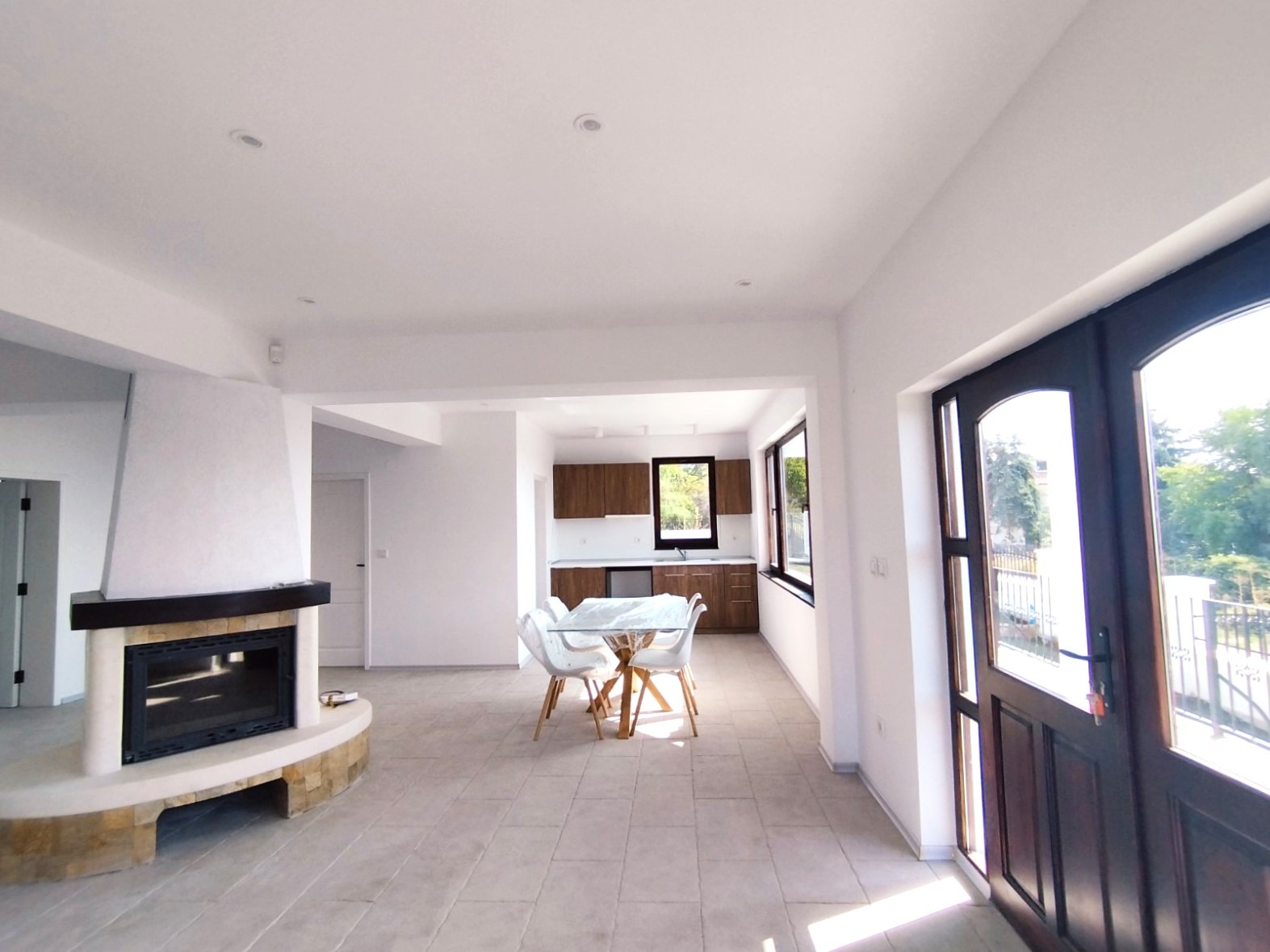 на първи етаж разположено входно антре, голяма слънчева дневна с кухненска част , тоалетна килер и веранда