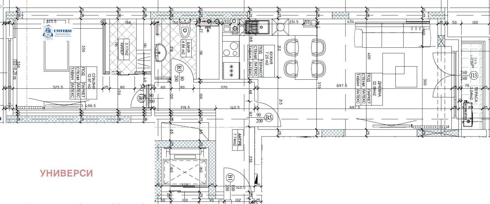 Обзавеждането е изцяло по индивидуален проект и е изработено съобразно даденостите на имота.
