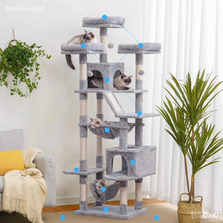 След активна игра, котките могат да се излегнат на добре подплатените горни платформи или на хамака, за да си починат или да наблюдават отвисоко заобикалящата ги среда.