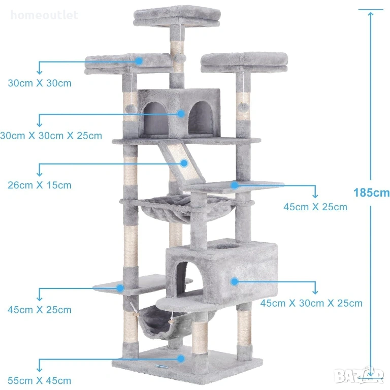 Тази катерушка за котки е висока 185 см и е подходяща за малки и пораснали домашни любимци, като е приложима за една или повече котки в дома.
