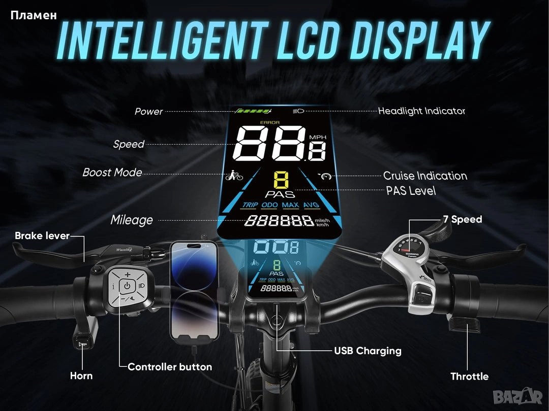 Три режима на скоростта - Велосипед - Подпомагане - Изцяло електрически