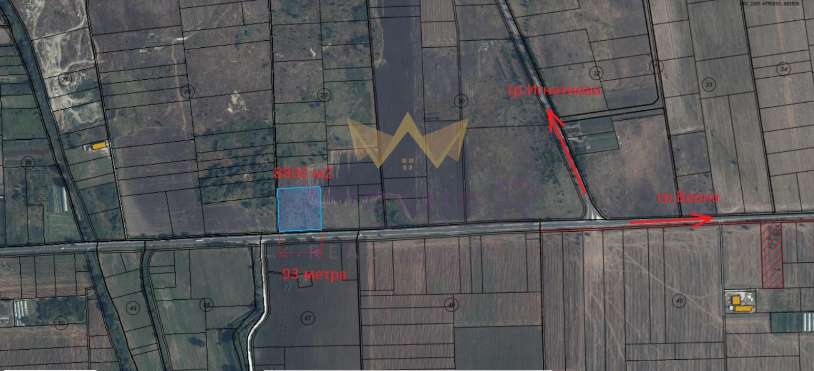 Парцел с площ 8800кв.м и лице на главен път: 93 метра.