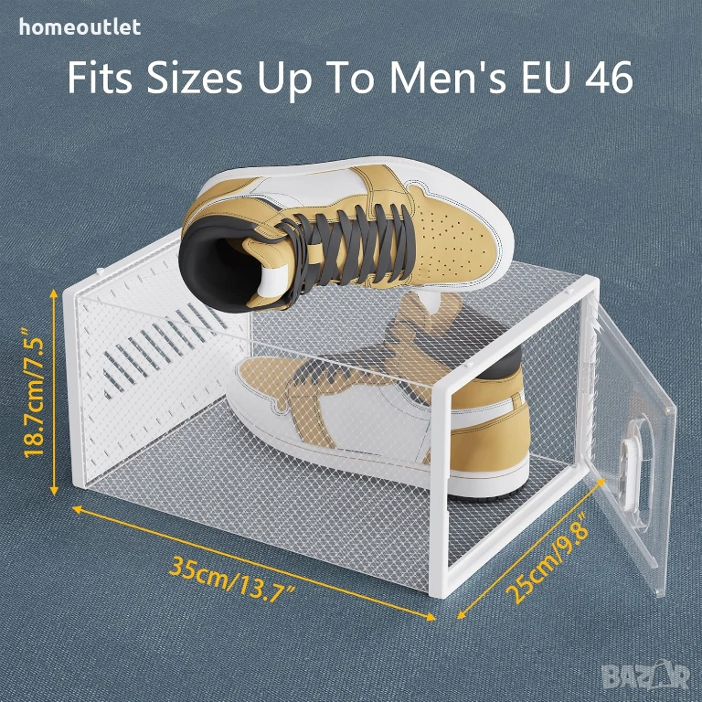 Кутията побира обувки с размер до EU 46.