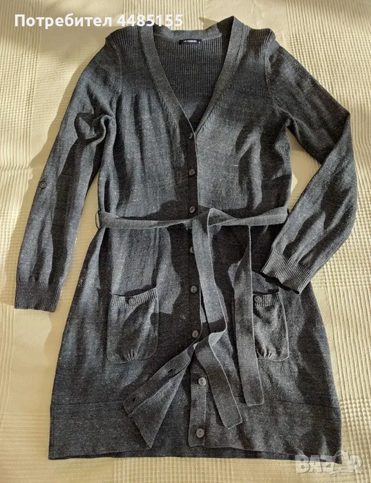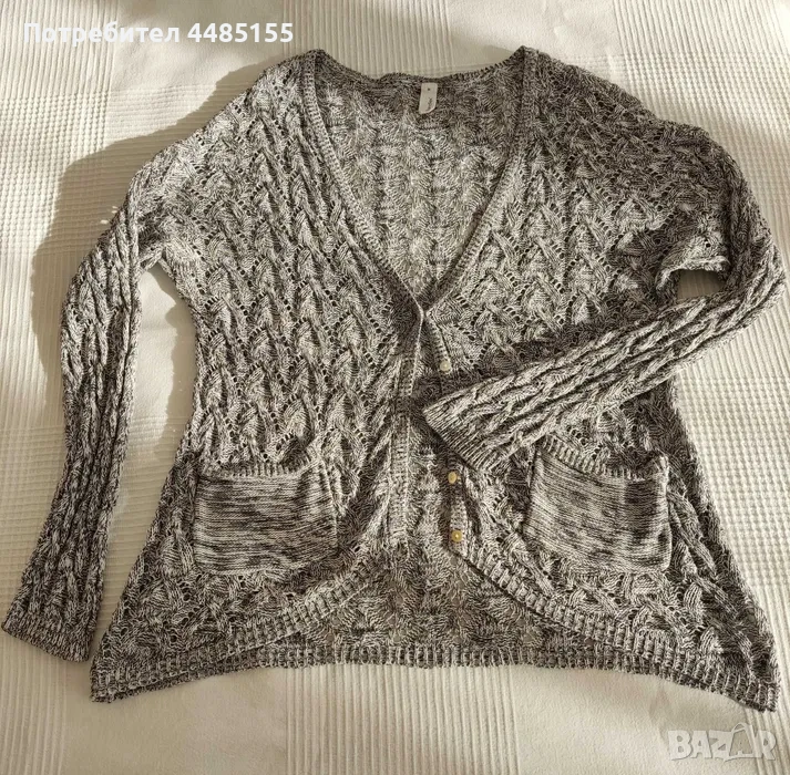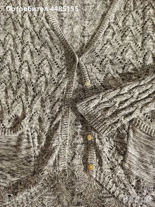 Жилетка friendtex, M. 100% памук. Цветът е меланж между бяло и черно. Има две джобчета и пет копчета отпред. Моделът е интересен. Материята е памучна и приятна. Пере се в пералня с бяло пране на 40 градуса и 600 оборота, много добре й се отразява, ръкавите възвръщат първоначалната си форма, ако са се разтегнали леко от обличането. Жилетката е лека, но пада добре надолу като я облечете. Плетивото е на дупки и е чудесно. Отпред е малко по-къса, отколкото отзад. В отлично състояние.