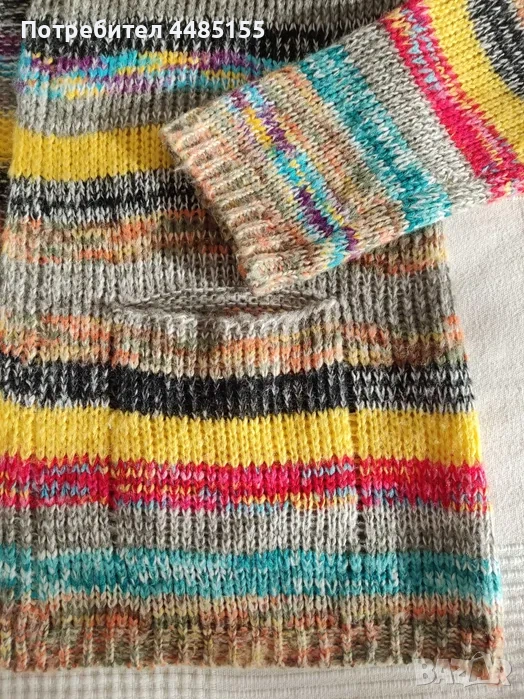 Весела многоцветна жилетка, М. Моделът е прав, без копчета, с два джоба отпред. Плетивото е машинно, но създава впечатление за ръчно. В отлично състояние. Винаги създава хубаво настроение и добри идеи.