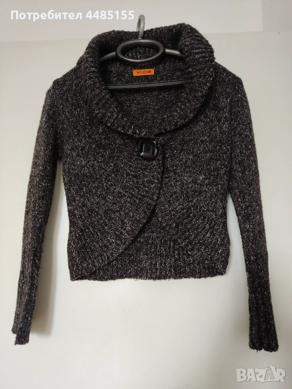 Красива жилетка с едно голямо копче, M/S. 50% мохер, 45% вълна, 5% спандекс. Черно/тъмносиво с лек меланж бяло. Моделът е елегантен, жилетката е топла и удобна. В отлично състояние. Дължина от рамото 50 см., от мишницата 27 см.