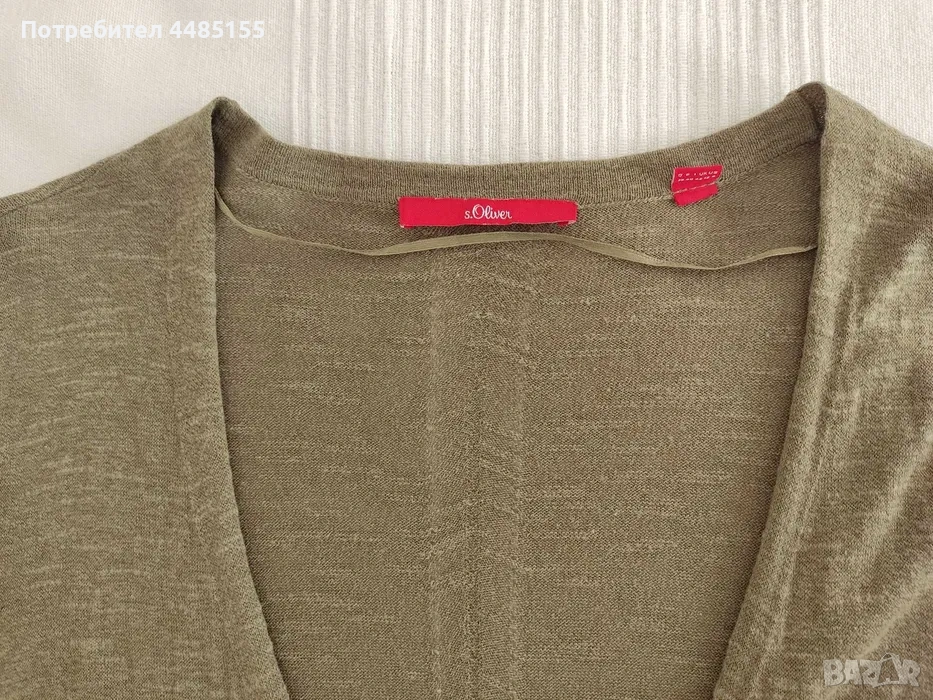Жилетка s. Oliver, M. 58% памук. Чудесна лека жилетка без копчета, с две цепки по 9.5 см. от страни. Цветът е меко и много приятно зелено. Моделът е семпъл, прав и стилен. Материята е с преобладаващ памук, мека, нежна и фина. Много благодатна жилетка за съчетаване с различни шалове и друго облекло. Обличала съм я два - три пъти само. В отлично състояние.