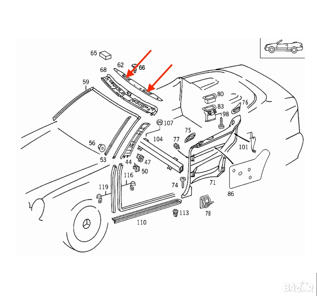 Mercedes W208 CLK, рамки заключване таван, soft top lock trim, CLK Cabriolet части, A2086900279, A2086900179, ABS автомобилни детайли