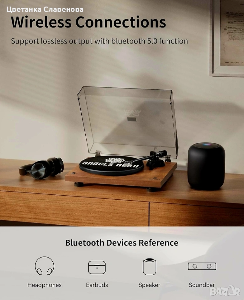 Вграденият Bluetooth 5.0 ви позволява да се наслаждавате на колекцията си от винили с цялото удобство на безжичната технология. Свържете се чрез Bluetooth технологията, за да слушате любимите си записи на безжичните си високоговорители, саундбар или слушалки. Премахнете проблемите, причинени от аудио кабела, и подобрете качеството на визуалното и слуховото възприятие.