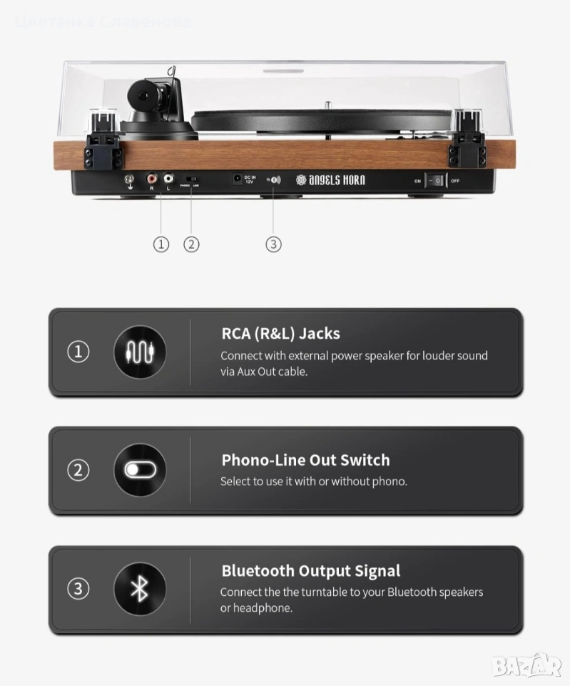 【Вграден фоно предусилвател и линеен изход】Вграденият фоно предусилвател може да изпълнява и да се наслаждава на музикалния живот, който ви предлага грамофонът на всеки усилвател. Вашият грамофон включва както фоно, така и линейни изходи, което позволява възпроизвеждане със или без фоно еквалайзер.Регулируема противотежест и тежест против пързаляне】Всеки класически грамофон е задължителен стандартен аксесоар. Можете да регулирате теглото и силата против плъзгане, за да осигурите контрол върху касетата и стилуса, който пасва перфектно в правилния жлеб на плочата и стабилно качество на звука на грамофона. Поддържайте яснотата и баланса на каналите на звука на виниловите плочи. И избягвайте шум, изкривявания и драскотини по виниловите плочи и стилусите.