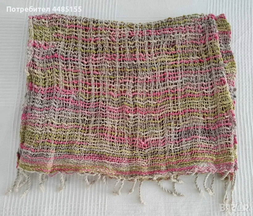 Памучен тъкан дамски шал в зелено и розоволилаво. Чудесен и приятен. В отлично състояние. Имам и други като него и ги нося с удоволствие есен, зима и пролет.