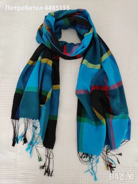 Красив, контрастен шал с ярки цветове - синьо, черно, червено, зелено и жълто. Дълъг и широк с ресни. Материя мека и приятна. Не се разтяга. В добро състояние.