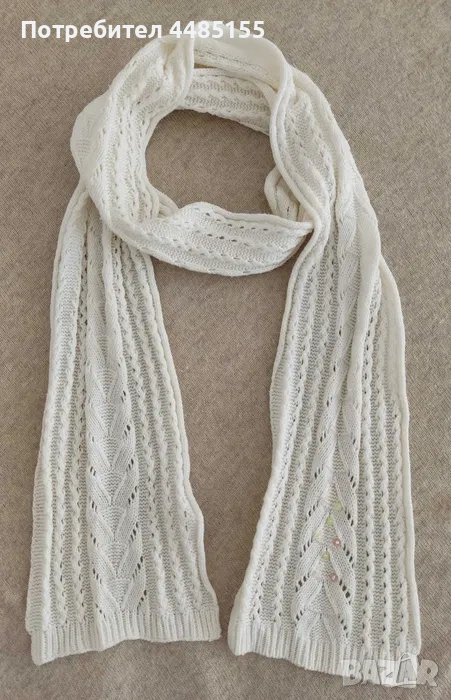 Бял шал, плетиво. Нежен и "невинен". Подходящ е и за момиче. Дълъг и тесен. Безупречен.