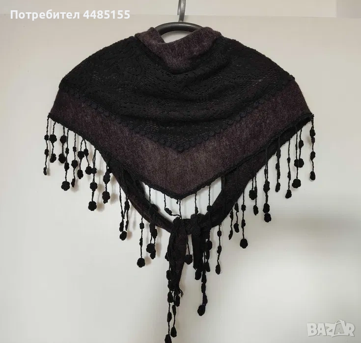 Триъгълен красив и стоплящ шал в тъмни цветове. Пришита му е триъгълна дантела с флорални мотиви. Обримчен е с памучен ширит, от който висят памучни цветчета като ресни. Усеща се като мек и приятен при допир. Би се съчетал чудесно с ярки или светли дрехи. В състава му се съдържа 15% памук. В много добро състояние. В единия му край лентата леко се е разшила, което може да се прихване на ръка с игла и конец. Преди просто бих го направила, но сега нося очила и не ми се отдава лесно при тъмни тъкани, за което се извинявам.