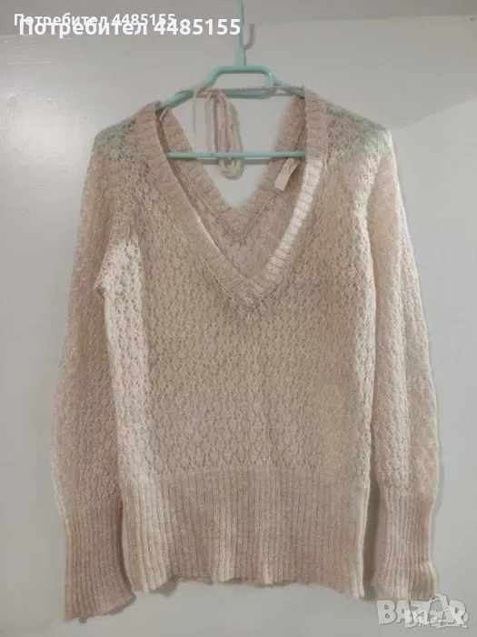 Великолепен луксозен нежен пуловер Ofelia, XL. По - скоро М/S. 35% мохер, 35% акрил, 30% найлон + LUREX, каквото и да значи това :) с фина златна нишка. Деколте, изрязано триъгълно отпред и отзад. Нов, безупречен. Изпран на ръка с фин препарат за плетива. Дължина от рамото 64 см., от мишницата 42 см.