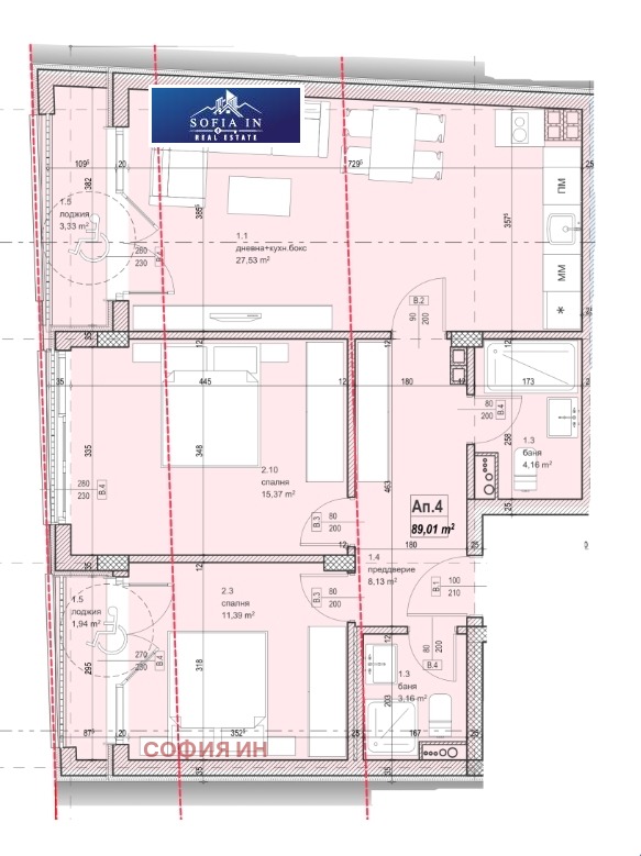 Предверие, дневна със столова и кухня, 2 спални, 2 бани + WС, склад, 2 лоджии