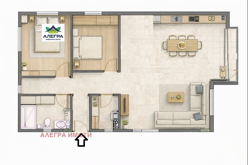Алегра Имоти предлага на Вашето внимание тристаен апартамент, разположен на шести жилищен етаж в новопостроена седеметажна кооперация с асансьор, в близост до Острова.