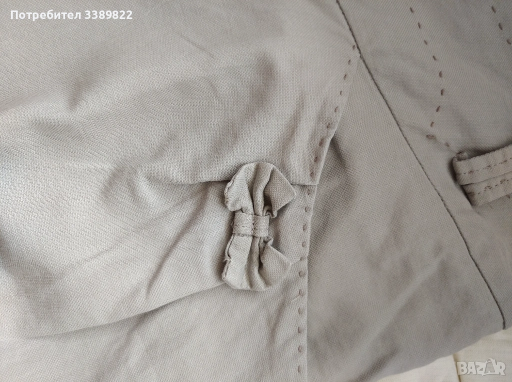 Продавам дамски панталон - св. сив цвят, широк (прав), закопчава се с цип и копче, има два предни джоба с декорация панделка, отзад два джоба имитация, дължина от външната страна на крачола 108см, дължина от вътрешната страна на крачола 81см, талия едностранно е приблизителна около 43см, размерът е приблизителен около L/ XL