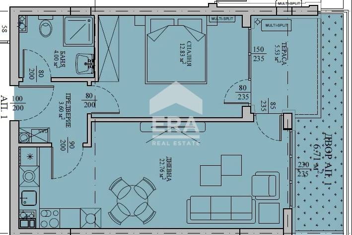 Апартамент номер 1, се намира на етаж 1 и се състои от входно антре, складово помещение, баня с тоалетна, просторна всекидневна с кухненски бокс и излаз към тераса. Имотът разполага със собствено дворно място с площ 6,71 кв.м осигуряващо комфорт, уединение и възможност за зелена зона, кът за отдих или детски кът.
