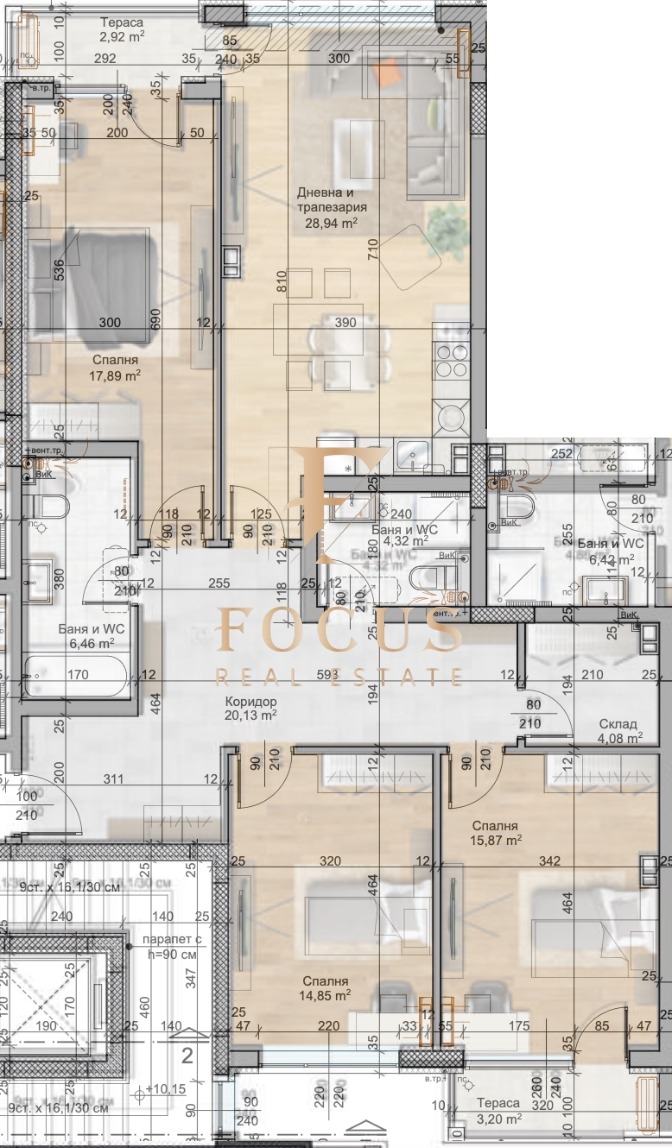 Апартаментът е с обща площ от 165,49 кв.м. със следното разпределение: антре, хол с кухненски бокс, три спални, три бани с тоалетни, склад и две тераси.