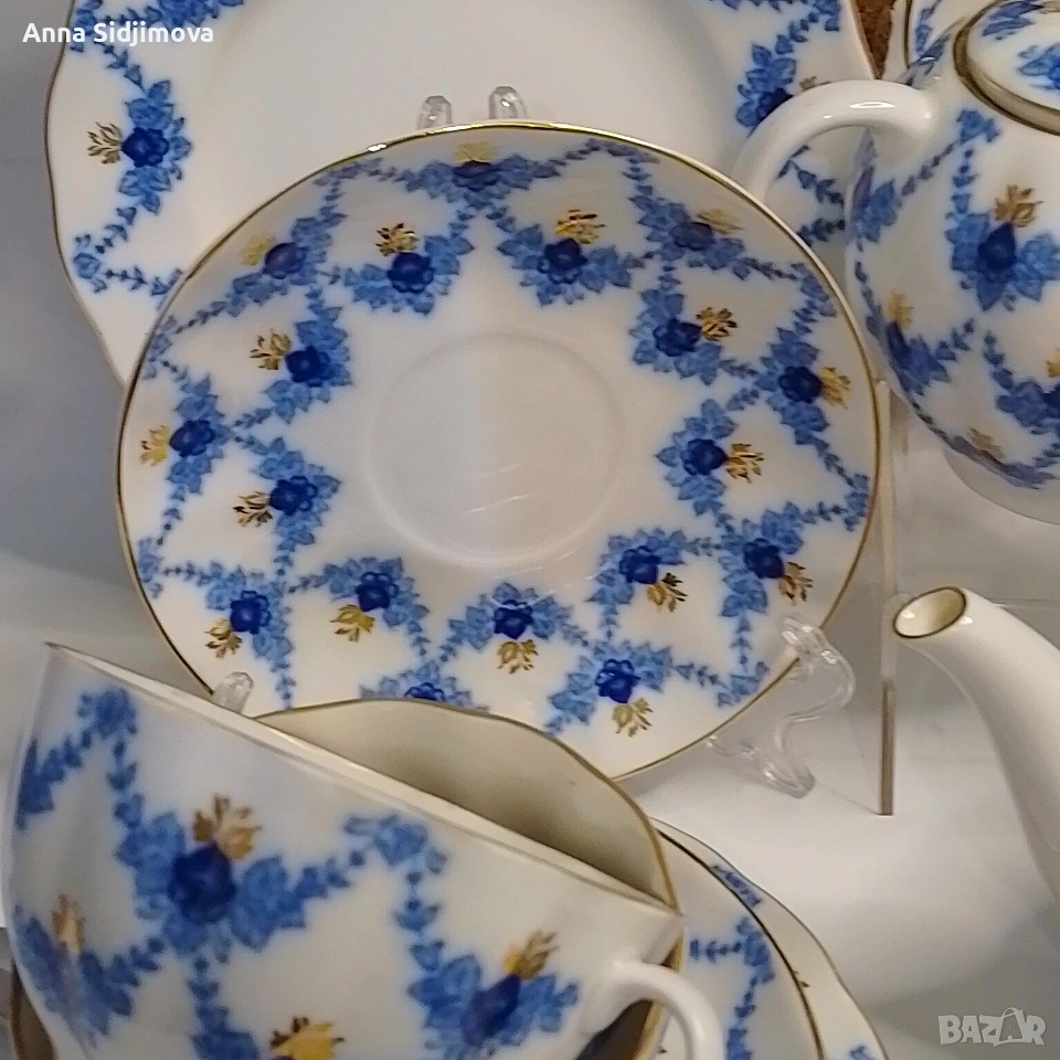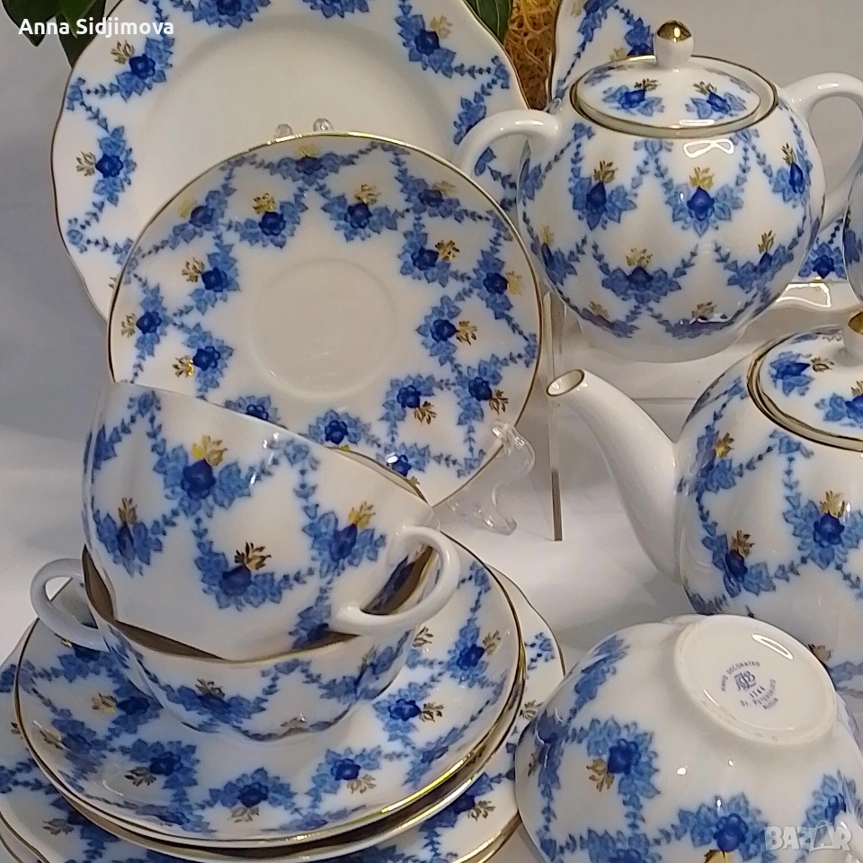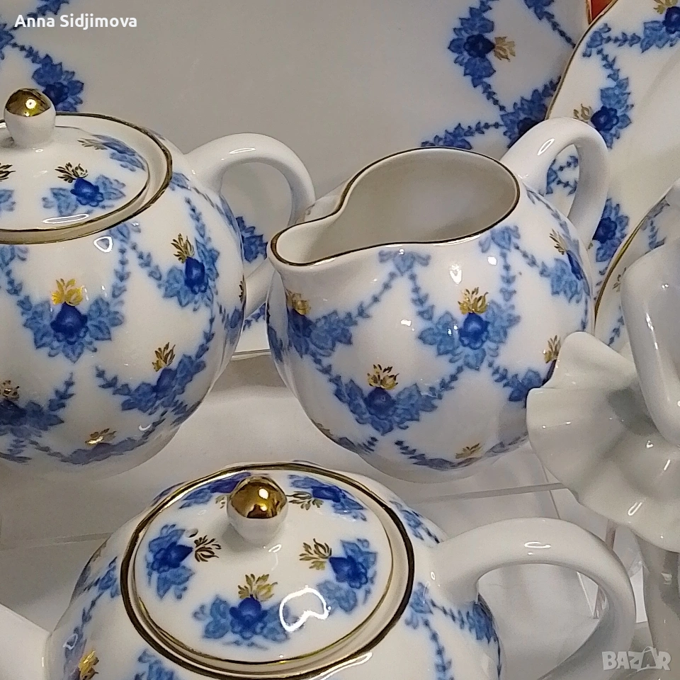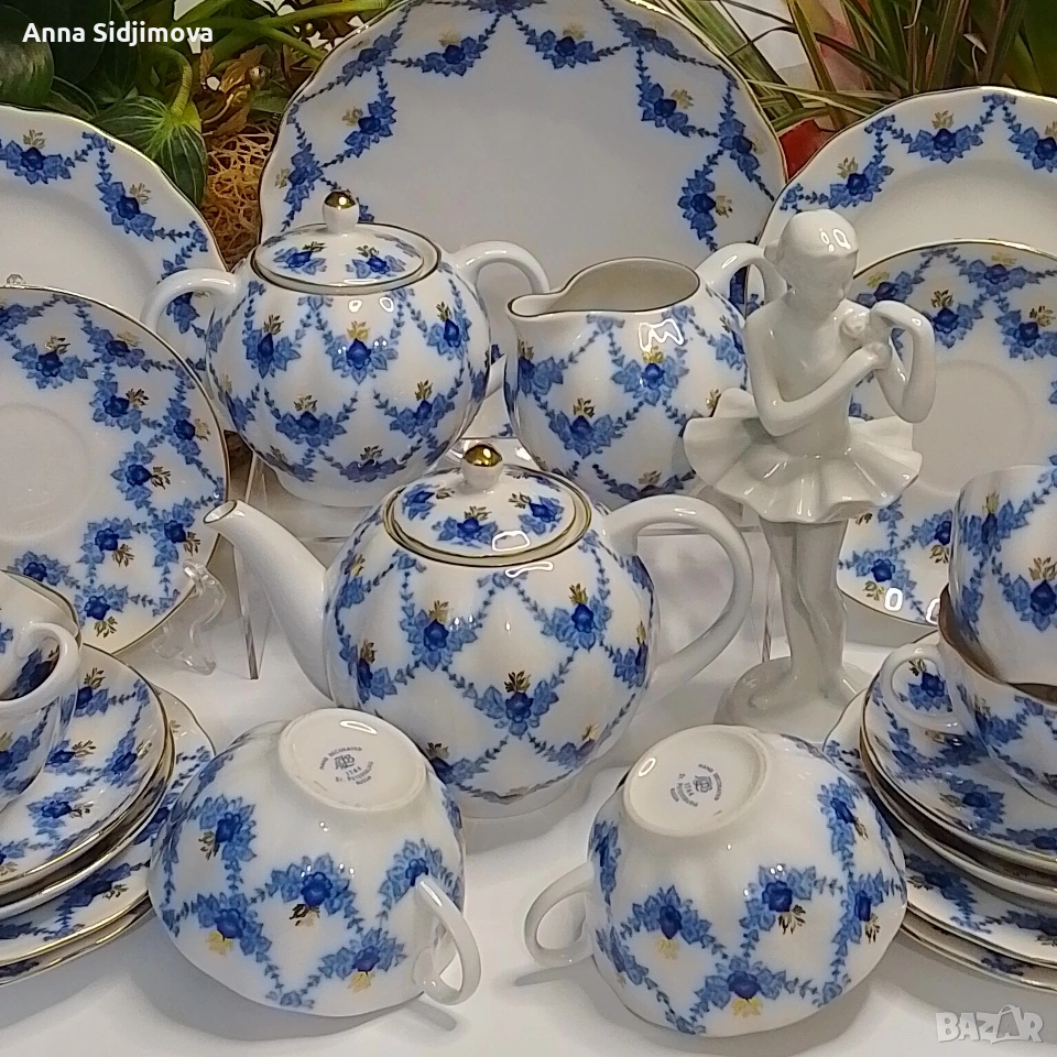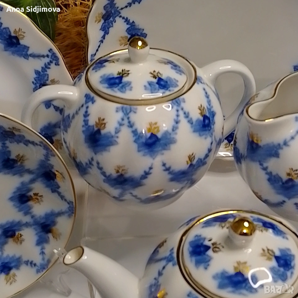 Рядък, колекционерски сервиз. Украсен с рисунък във формата на гирлянди от сини листа — подглазурен кобалт, декол с ръчно дорисуване със злато.