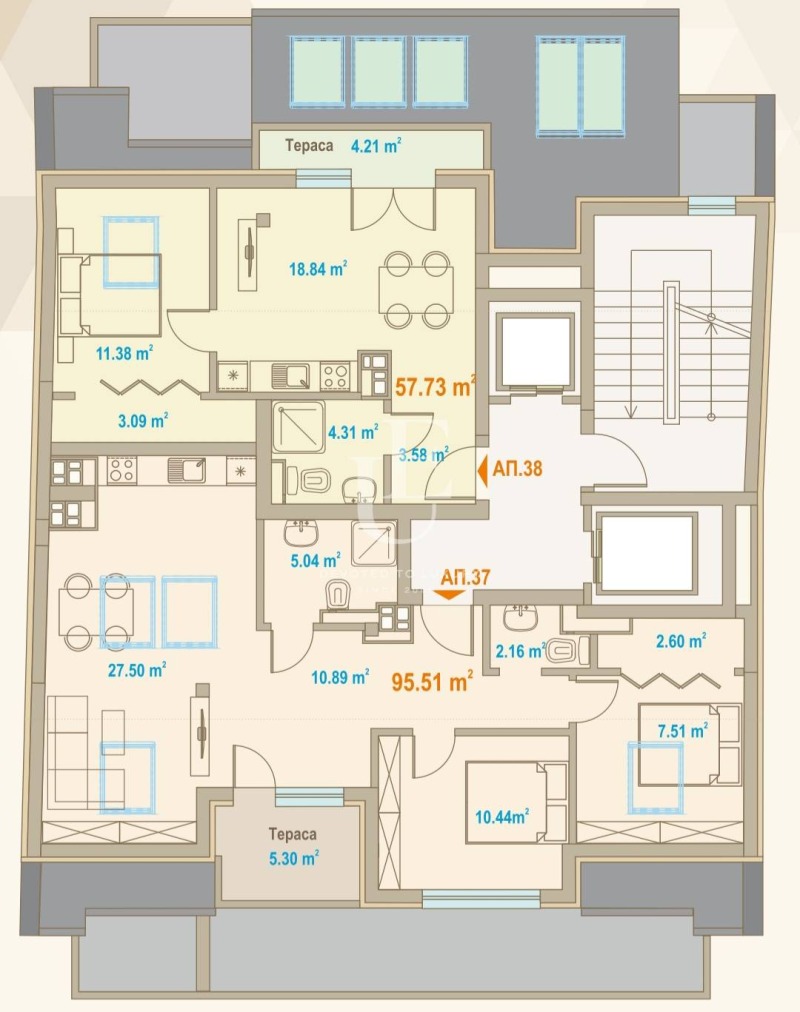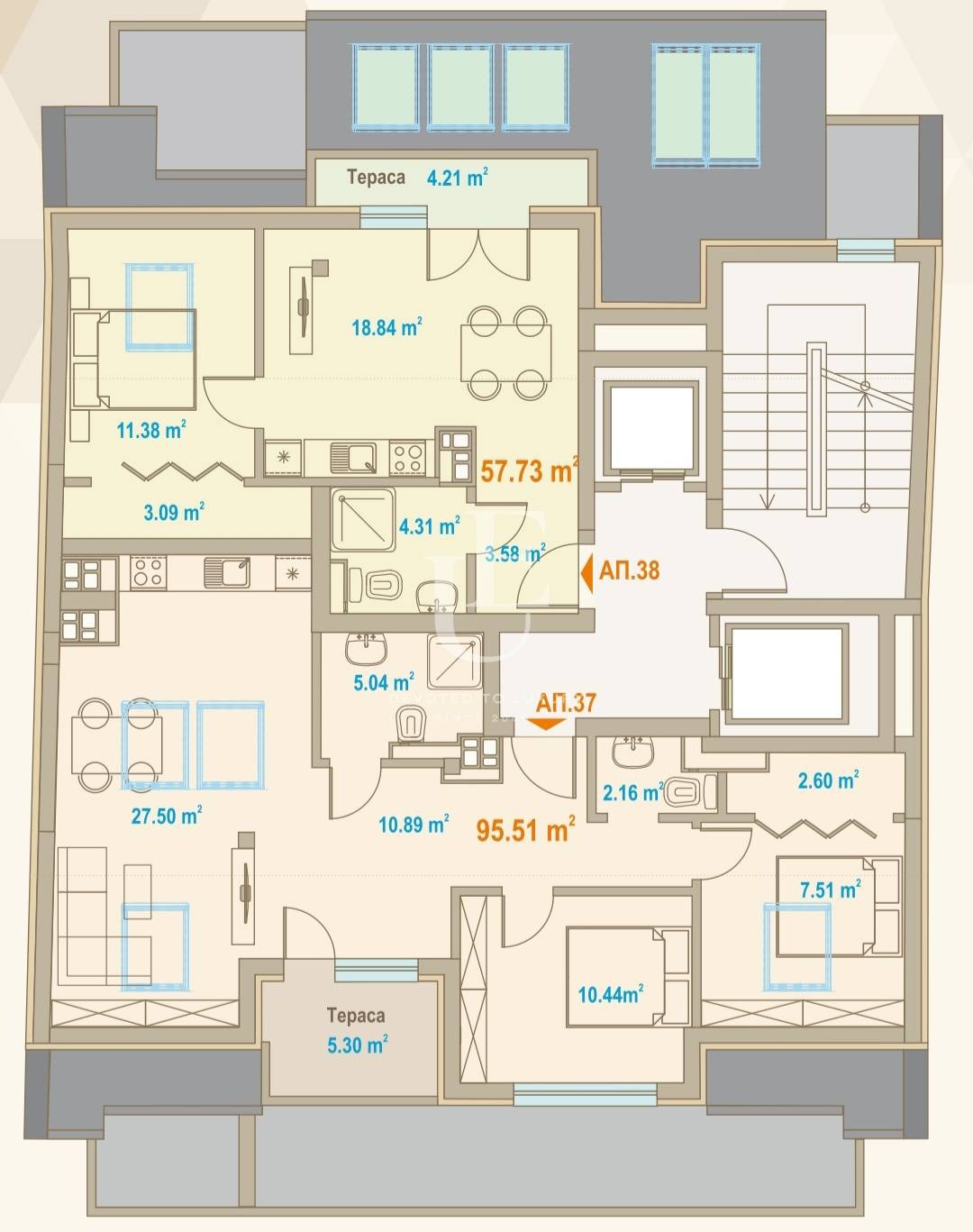 Два апартамента, обединени в един- хол с трапезария и кухня, 3 спални, 3 бани с тоалетни и 2 тераси. Ref. ID:28443