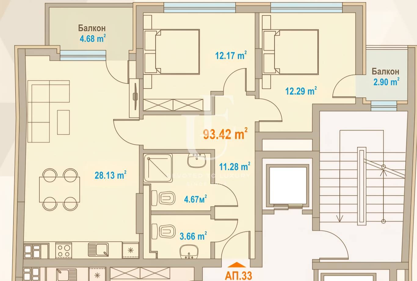 Апартаментът се състои от хол с трапезария и кухня, две спални, 2 бани с тоалетни, и 2 тераси Ref. ID:28451