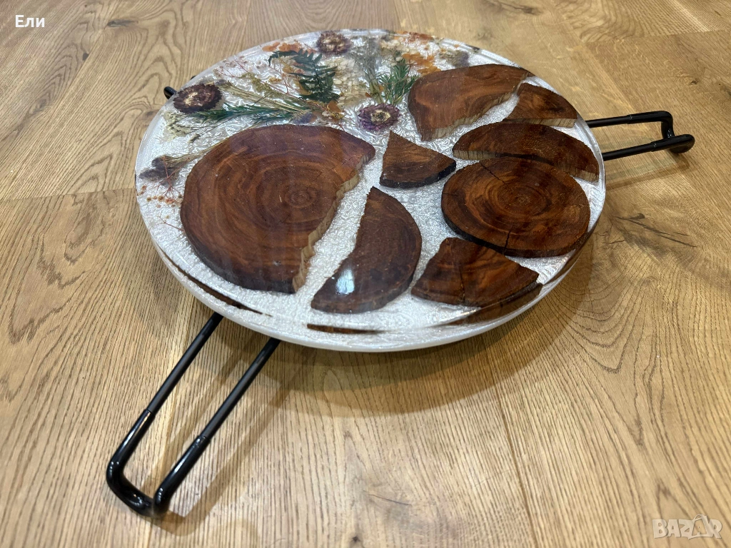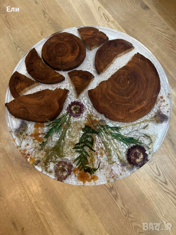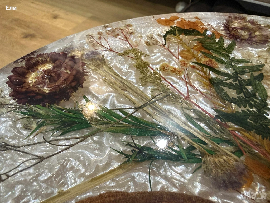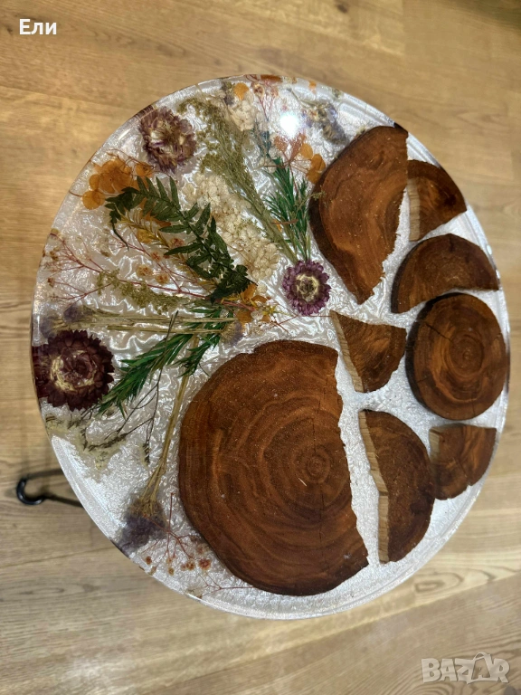 Използвани са естествени материали от природата като дърво от череша. А красотата на естествените, изсушени цветя вложени в нея ще ви накара да я съзерцавате с часове, без да ви омръзне. За пълнежа е използвана първокачествена епоксидна смола с кадифени цветове. Краката на масичката са сгъваеми, което дава възможност при необходимост да се превърне в компактна мебел, удобна за съхранение до следващото и използване.