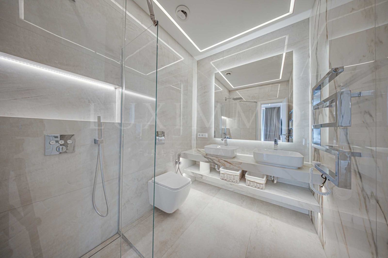 Имотът е светъл, предлага модерна дизайнерска визия и интериор с изчистени линии. Големите прозорци допринасят за простор и изобилие на светлина, а качествените материали и изискани мебели - за уют и елегантност.