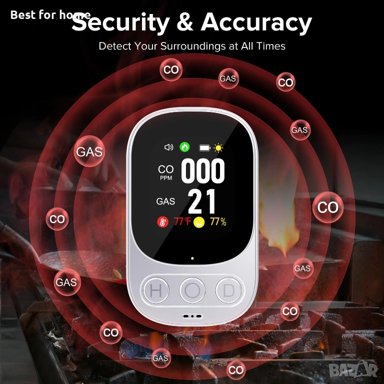 а разлика от стандартните аларми, този модел осигурява пълен контрол над безопасността и микроклимата във вашия дом. Той следи за "тихия убиец" (въглероден оксид), за течове на взривоопасни газове и ви информира за комфорта на средата чрез измерване на температура и влажност.