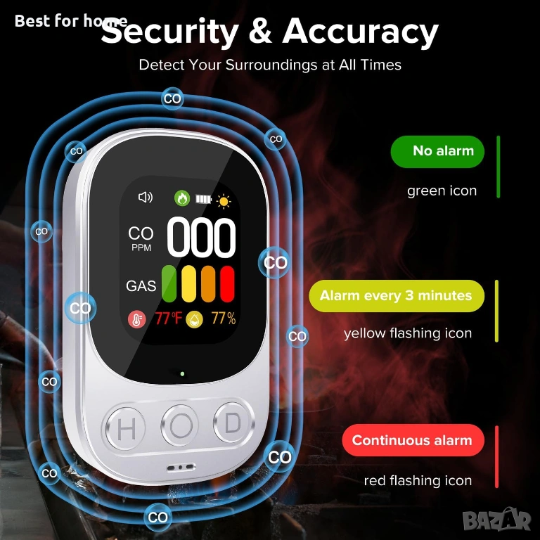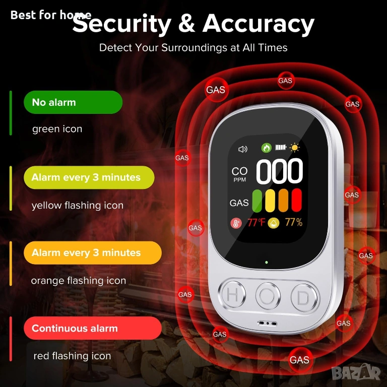 Гласова и звукова аларма: При засичане на опасност устройството издава силен звуков сигнал (85dB) и визуално предупреждение, за да гарантира незабавна реакция.