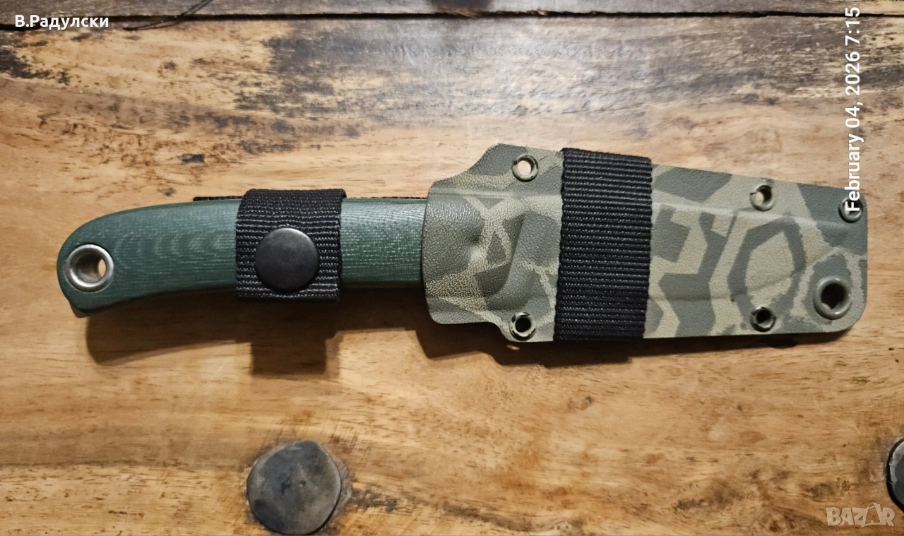 Ножът е регринднат професионално и е сведен на 0,22 мм. Канията е комуфлажна. Само нож и кания.