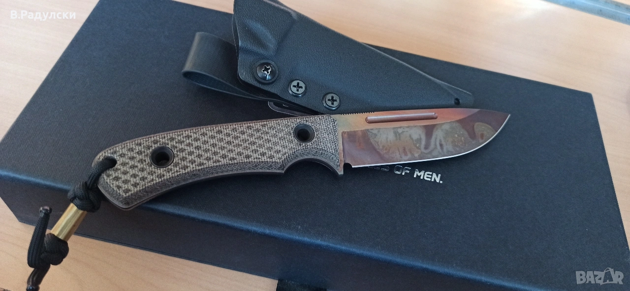 Нов, с кутия и документи. Изключително грамотно и тънко сведен нож. Стоманата в D2, бронзови шайби, много лек и компактен нож.
