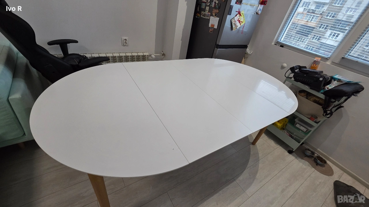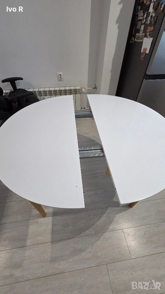 Продавам старите ми маса и 4 стола използвани с нея около 3 години. Масата е купувана от JYSK, разтегателна с издърпващ се механизъм. Вкл. 2 крила. Кръглата кухненска маса има бял плот от MDF и крака от масивна дървесина.При нужда масата може лесно да бъде удължена до 200 см дължина. Ø110 x В75 см. Има нормални следи от употреба (видимо на снимките), но е в много добро състояние.