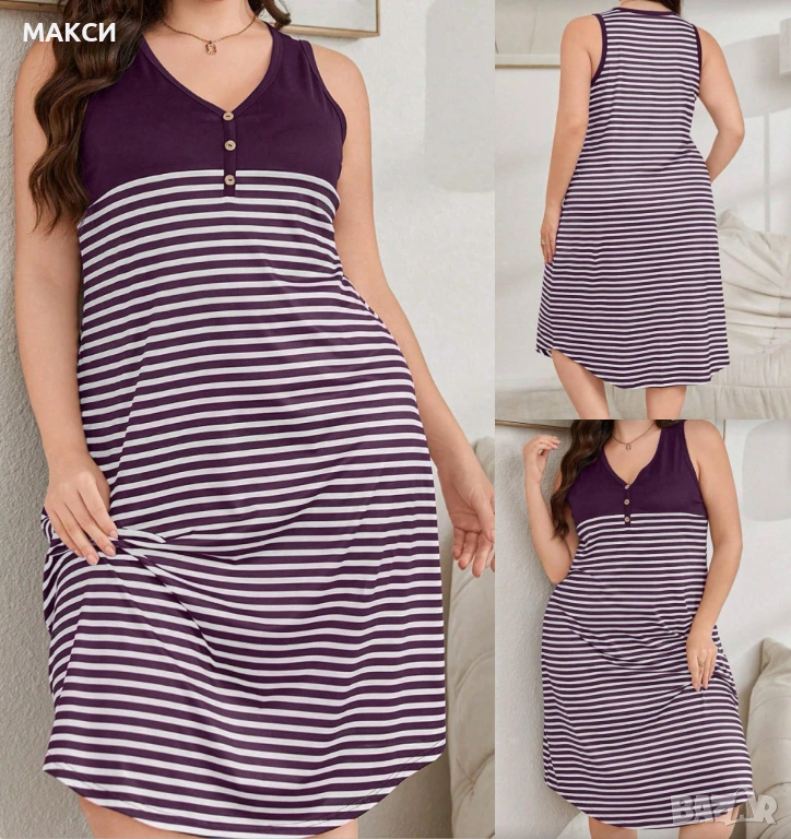 Макси силно еластична рокля без ръкави с декоративни копченца в черно-бяло и лилаво-бяло райе → Обява 53088992