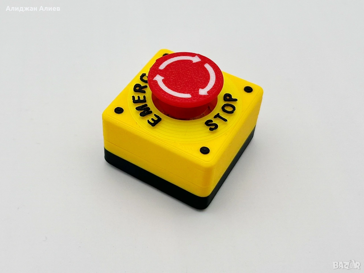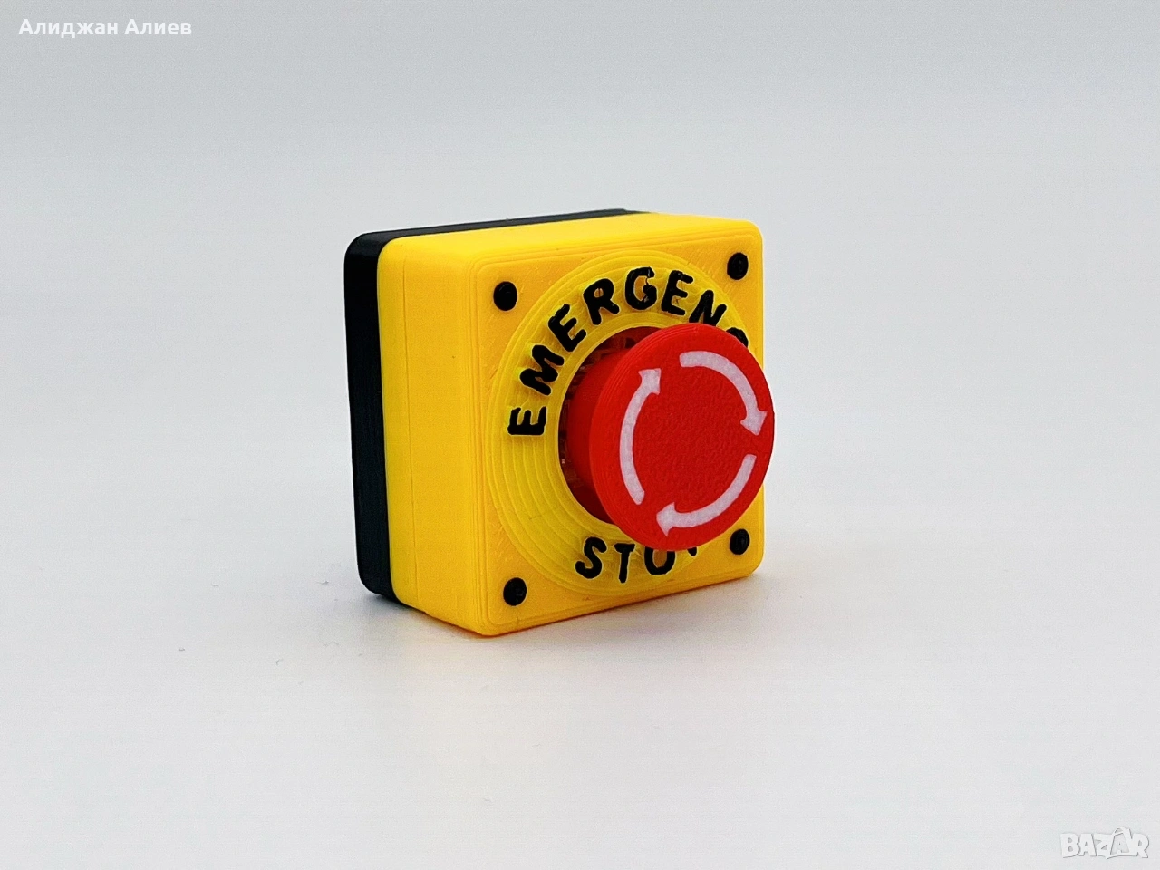 Антистрес играчка „Emergency Stop“. Компактна и удобна за ръката, с въртящ се бутон за приятно щракане и разтоварване на напрежението. Идеална за бюро, офис или подарък. Изработена на 3D принтер от здрав материал. Подходяща за фиджет и релакс.