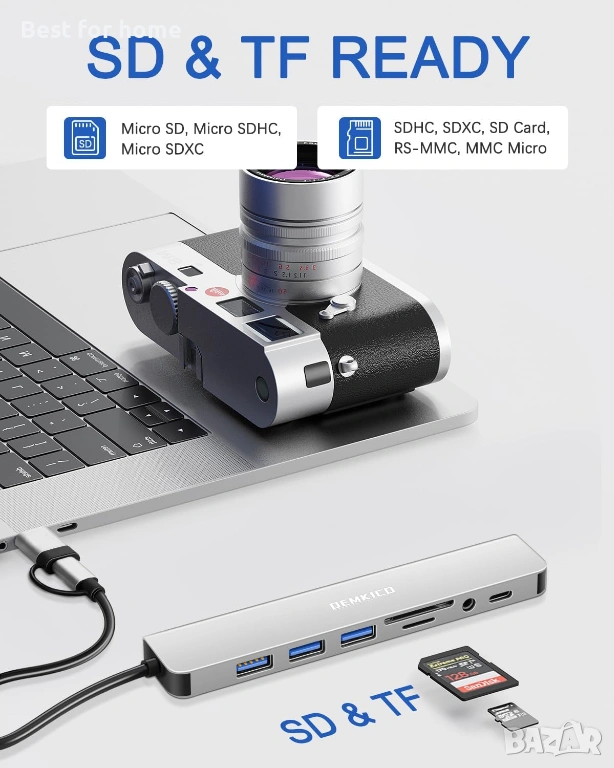 Четец за SD и MicroSD (TF) карти: Осигурява мигновен достъп до снимки и видео материали от камери и телефони.