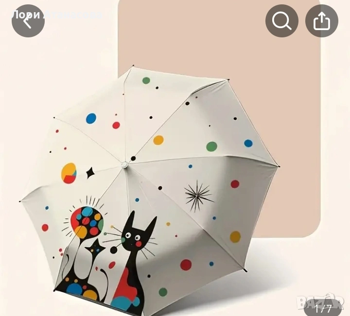 Цветна чадър с точки и черно коте -Модерен автоматичен и компактен чадър с 8-ребра → Обява 53089401
