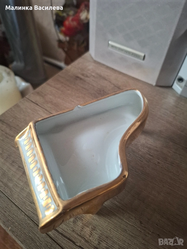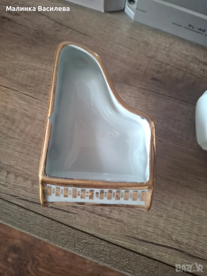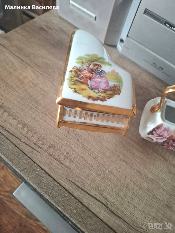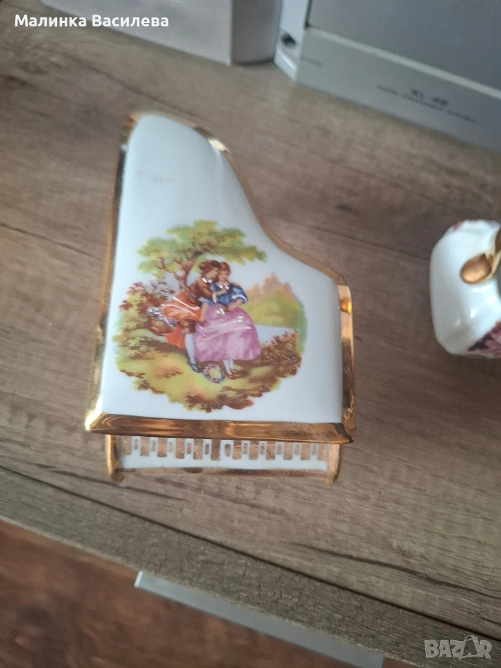 Порцеланова бижутерка във формата на пиано, с романтична сцена и златисти орнаменти.