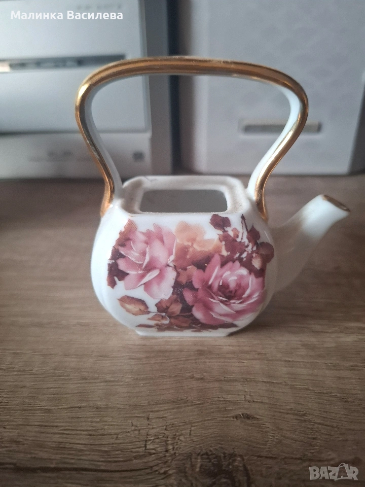 Мини декоративна каничка/чайниче с флорален мотив и златиста дръжка, без забележки.