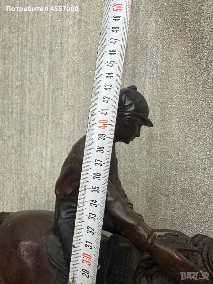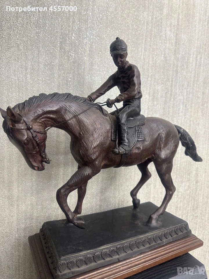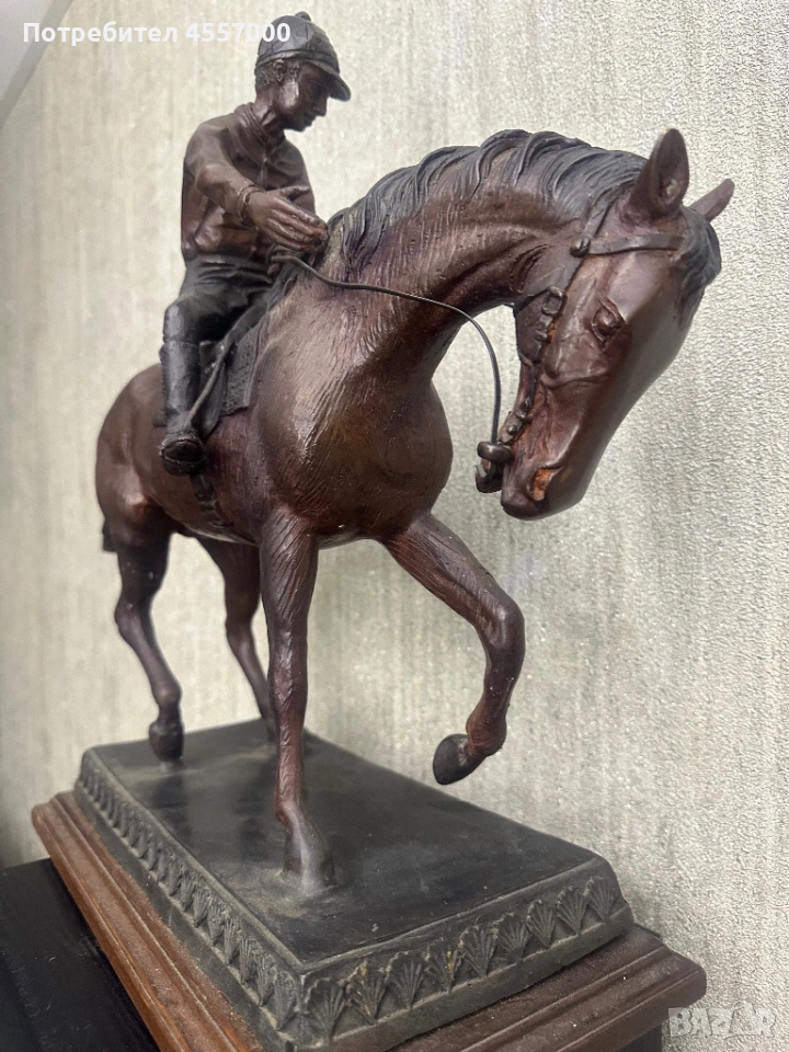 бронзова статуетка на жокей върху състезателен кон. Скулптурата е масивна отливка с отлична изработка, подходяща за ценители, колекционери или за луксозен подарък.