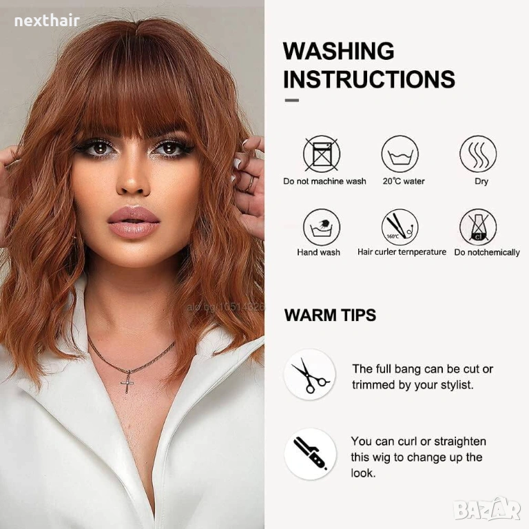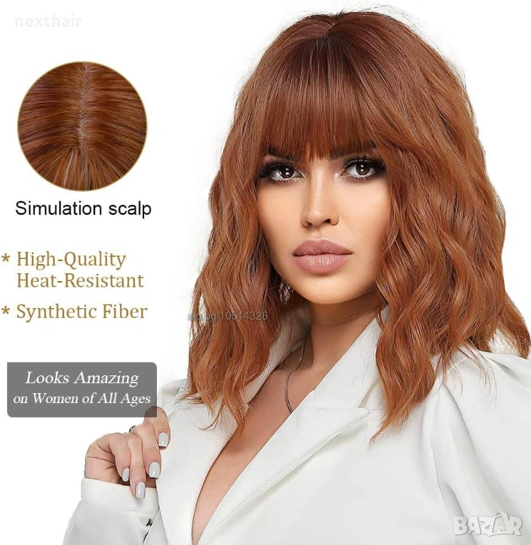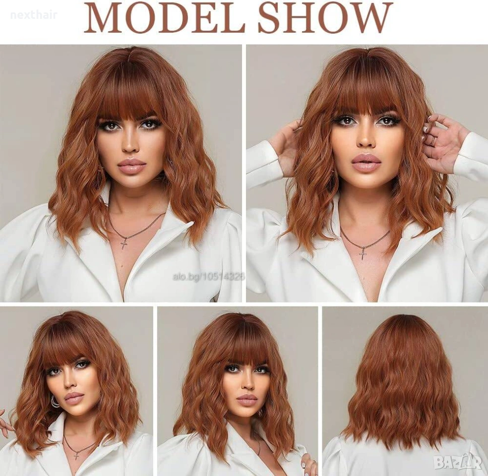 Кестеняво оранжева къса вълнообразна перука с бретон → Обява 53090153