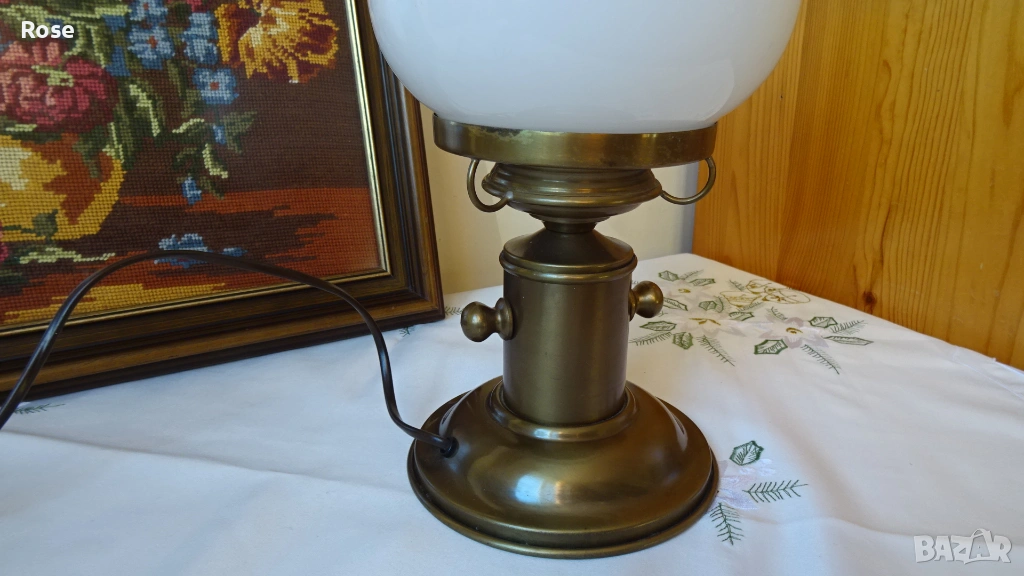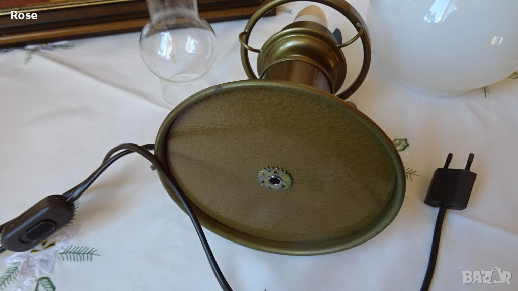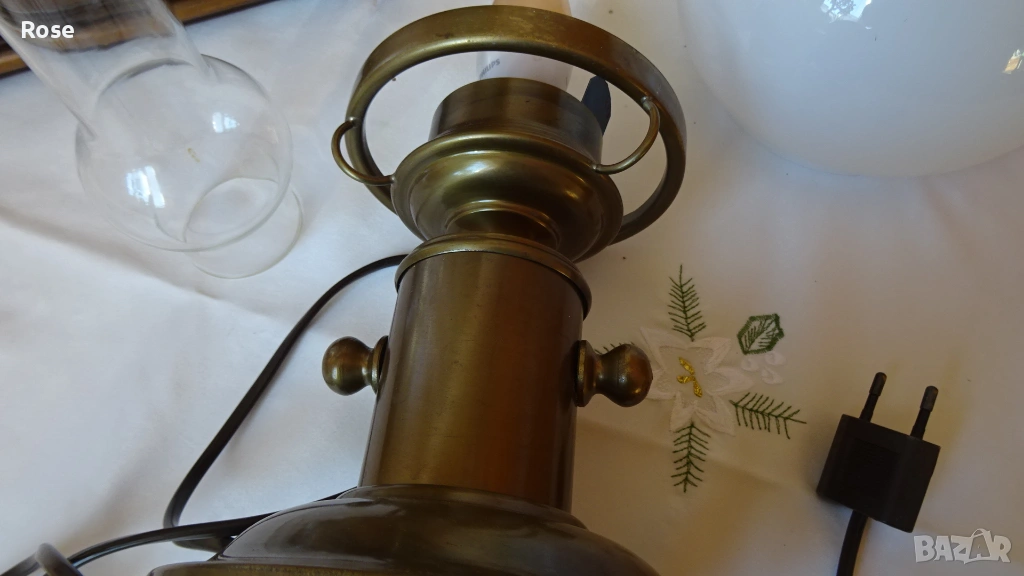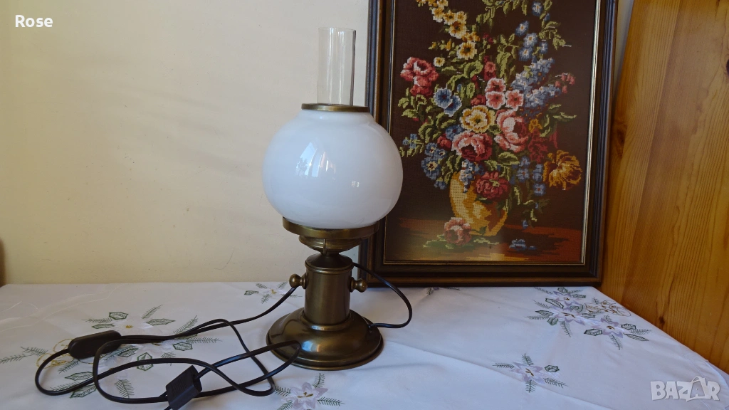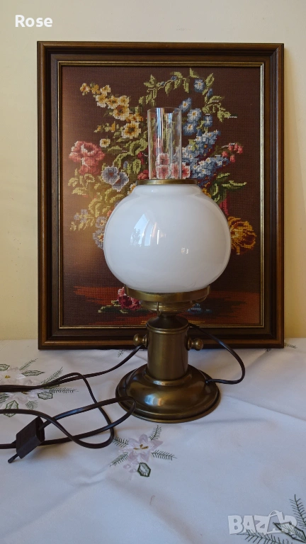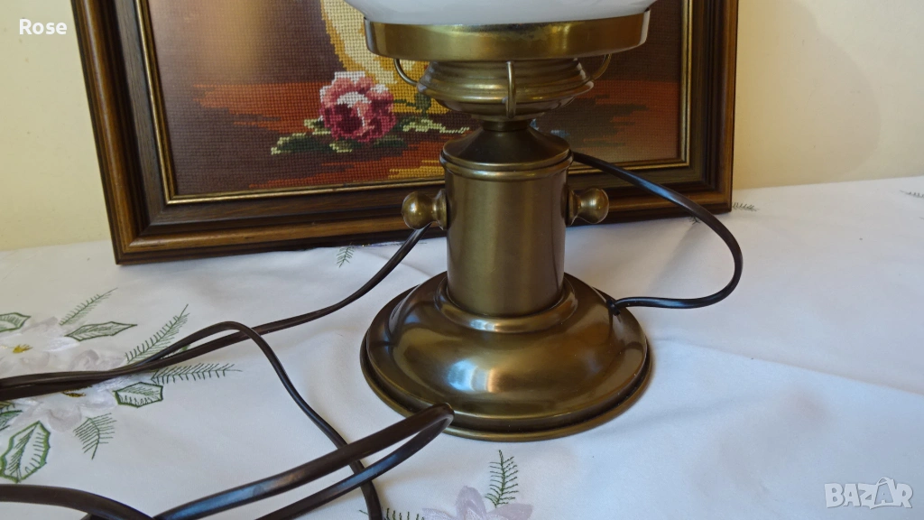 Винтидж настолна, месингова лампа със стъклен аплик и шише в