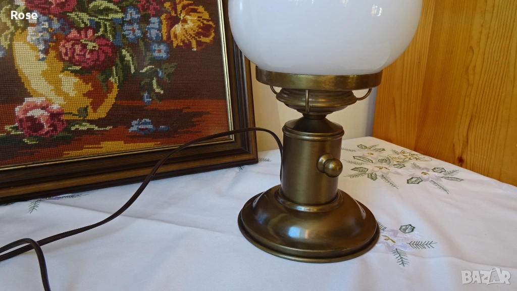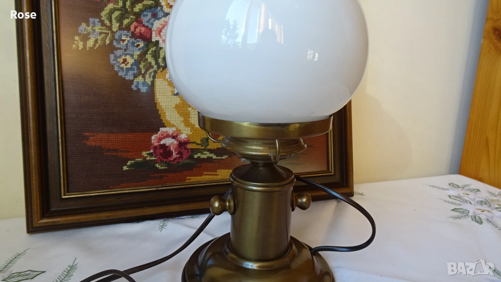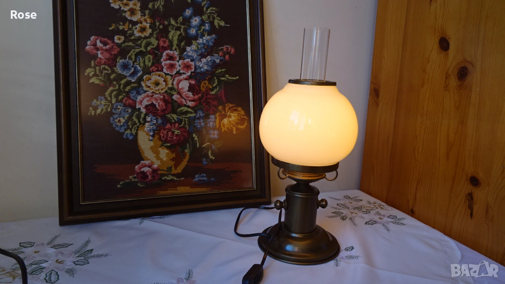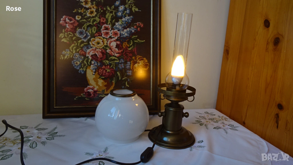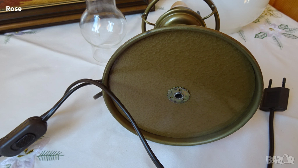 Винтидж настолна, месингова лампа със стъклен аплик и шише в