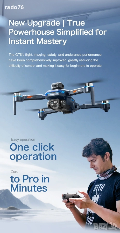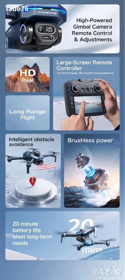 Изживейте усъвършенствана въздушна фотография с нашия 2.4G безчетков дрон с оптичен поток – идеален за ентусиасти и любители • Заснемане с висока разделителна способност: Оборудван с 4K широкоъгълна WIFI камера на предния обектив – безпроблемно превключвайте ъглите нагоре и надолу за динамични въздушни снимки. Разполага с усъвършенствана електронна стабилизация на изображението (EIS), за да осигури кристално ясни снимки и стабилни HD видеоклипове дори при ветровити условия. Заснемайте зашеметяващи пейзажи, ярки сцени и запомнящи се моменти отгоре с професионална яснота. • Интелигентни режими на полет: Включва режим на задържане на височина, позициониране на оптичен поток и технология за задържане във фиксирана точка – осигурявайки стабилно и безпроблемно летене. Идеален за начинаещи и опитни пилоти, търсещи плавни и надеждни полети за фотография или ежедневно летене. • Удължено време на полет и наблюдение в реално време: Захранва се от литиева батерия с висок капацитет 3.7V 1300mAh – предлага приблизително 20 минути непрекъснат полет. Вграденият LCD дисплей за захранване на дистанционното управление помага за наблюдение на състоянието на батерията с един поглед, като гарантира, че никога няма да загубите контрол по време на полет.• Персонализируеми полетни траектории: Начертайте желания маршрут директно в мобилното приложение — дронът ще следва проектирания от вас път за креативна въздушна видеозаснемане или структурирани инспекции. Идеален за заснемане на сложни сцени, проследяване на движещи се обекти или изследване на труднодостъпни места.• Лесен за потребителя контрол и функции чрез приложението: Пълен контрол чрез мобилното приложение – включва режим без глава, 3D обръщания, задържане на височина и многопосочно летене (нагоре/надолу/напред/назад/наляво/надясно). Насладете се на интуитивна работа, подходяща за всички нива на умения, с бързо реагиращи контроли.• Прецизност на жестовете и оптичния поток: Разширеното разпознаване на жестове позволява лесно заснемане на снимки с прости ръчни сигнали. Оптичното позициониране на потока осигурява стабилно зависване на закрито и на открито, поддържайки прецизно позициониране дори в среди с компрометиран GPS.• Мощни и издръжливи безчеткови двигатели: Оборудвани с високопроизводителни безчеткови двигатели — осигуряващи по-голяма мощност, по-тиха работа и по-дълъг експлоатационен живот. Осигурява стабилен полет, ефективно използване на енергия и повишена издръжливост с течение на времето.• Лек и преносим дизайн: Тегло само 177 грама – достатъчно лек, за да се избегнат строгите национални разпоредби за регистрация на дронове, което го прави идеален за пътуване, приключения на открито или ежедневна употреба. Не се изискват проблеми със сертифицирането в повечето региони.• Технология против смущения и стабилност: Разполага с 2.4GHz технология против смущения и шестосен жироскоп за по-плавни и стабилни полети и прецизен контрол. Идеален за заснемане на висококачествени изображения и видеоклипове, независимо от условията на околната среда. Комплектът включва:- 1 x Високопроизводителен квадрокоптер с HD камера- 1 x Ергономично дистанционно управление- 1 x 3.7V 1300mAh акумулаторна батерия - 8 резервни перки за продължителни полети - 1 USB кабел за зареждане за удобно презареждане - 1 отвер