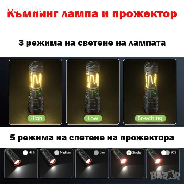 • Къмпинг осветление (3 режима): мека и равномерна жълта светлина за палатка или лагер