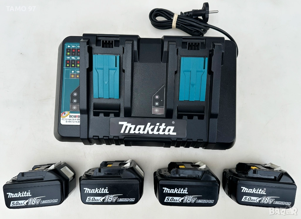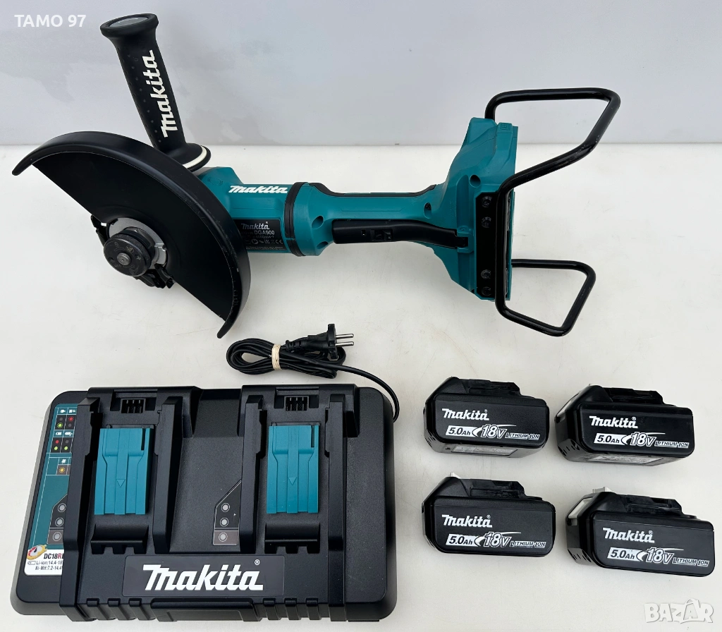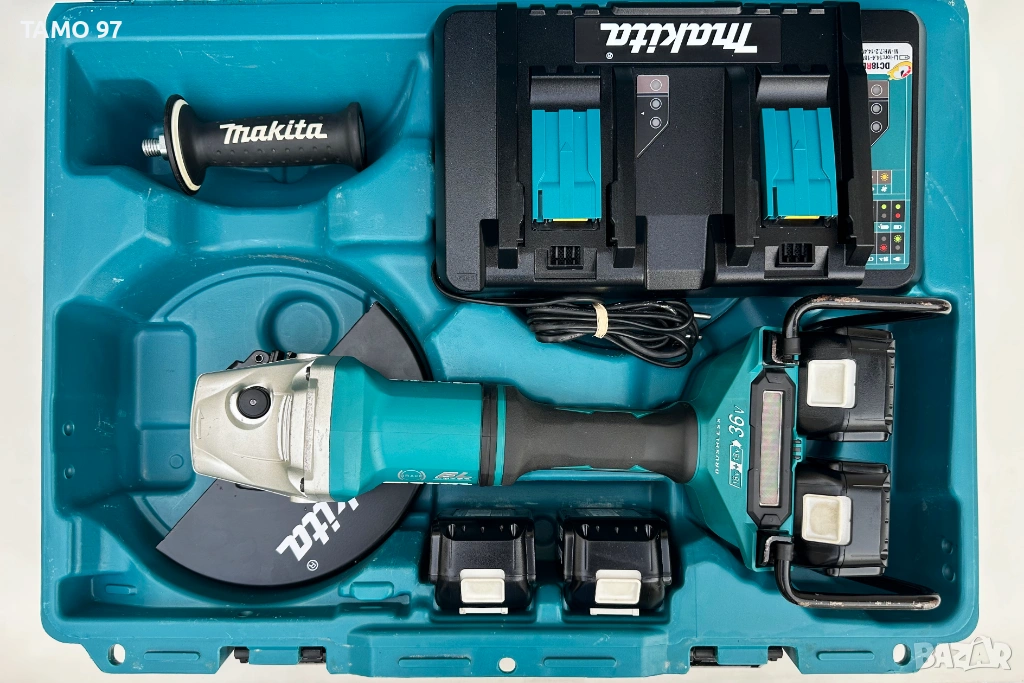 Макита неразличим от нов и използван броени пъти само, както се вижда на снимките без следи от използването и работи брилянтно, внос от Франция. Комплекта включва ъглошлайф с предпазтител, антивибрационна ръкохватка, бързозатягаща гайка за диск, 4 броя батерии по 18V 5.0Ah, двойно бързо зарядно и оригинален куфар.
