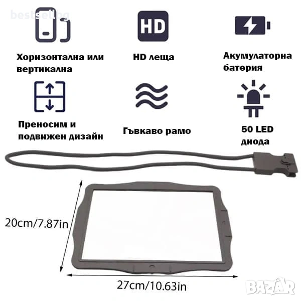 • Ръчна лупа – отделете стойката и използвайте самостоятелно