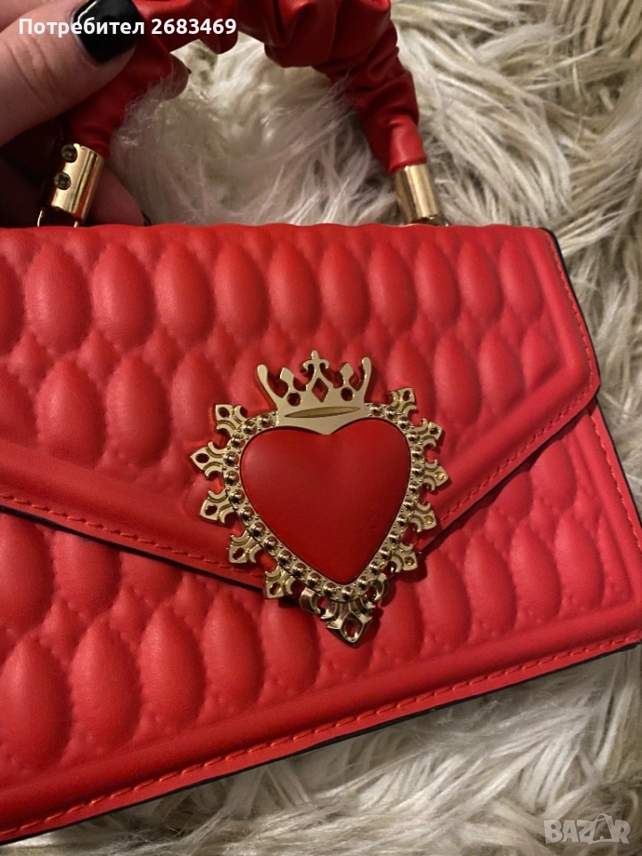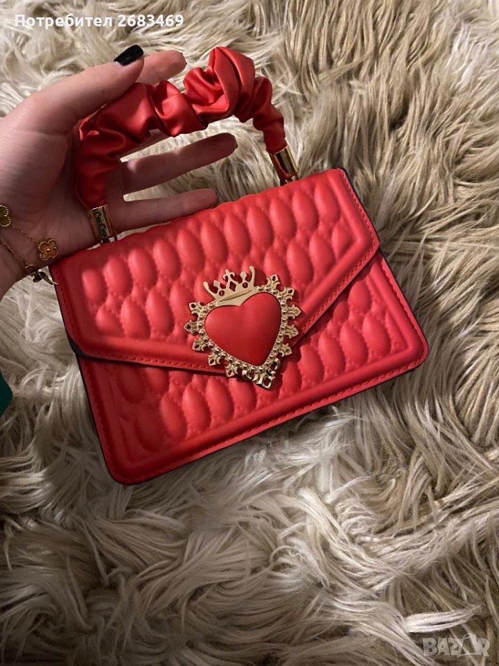 Продавам много сладка червена чанта с ефектен дизайн и златисто сърце с корона отпред.